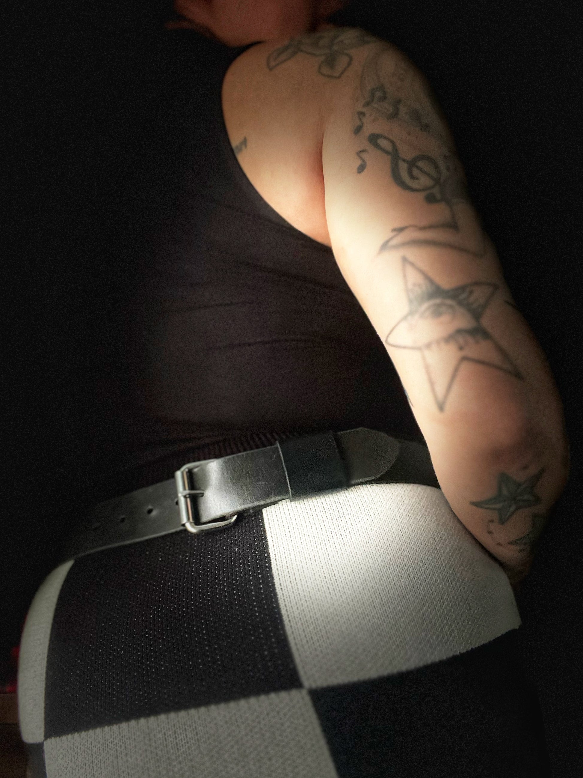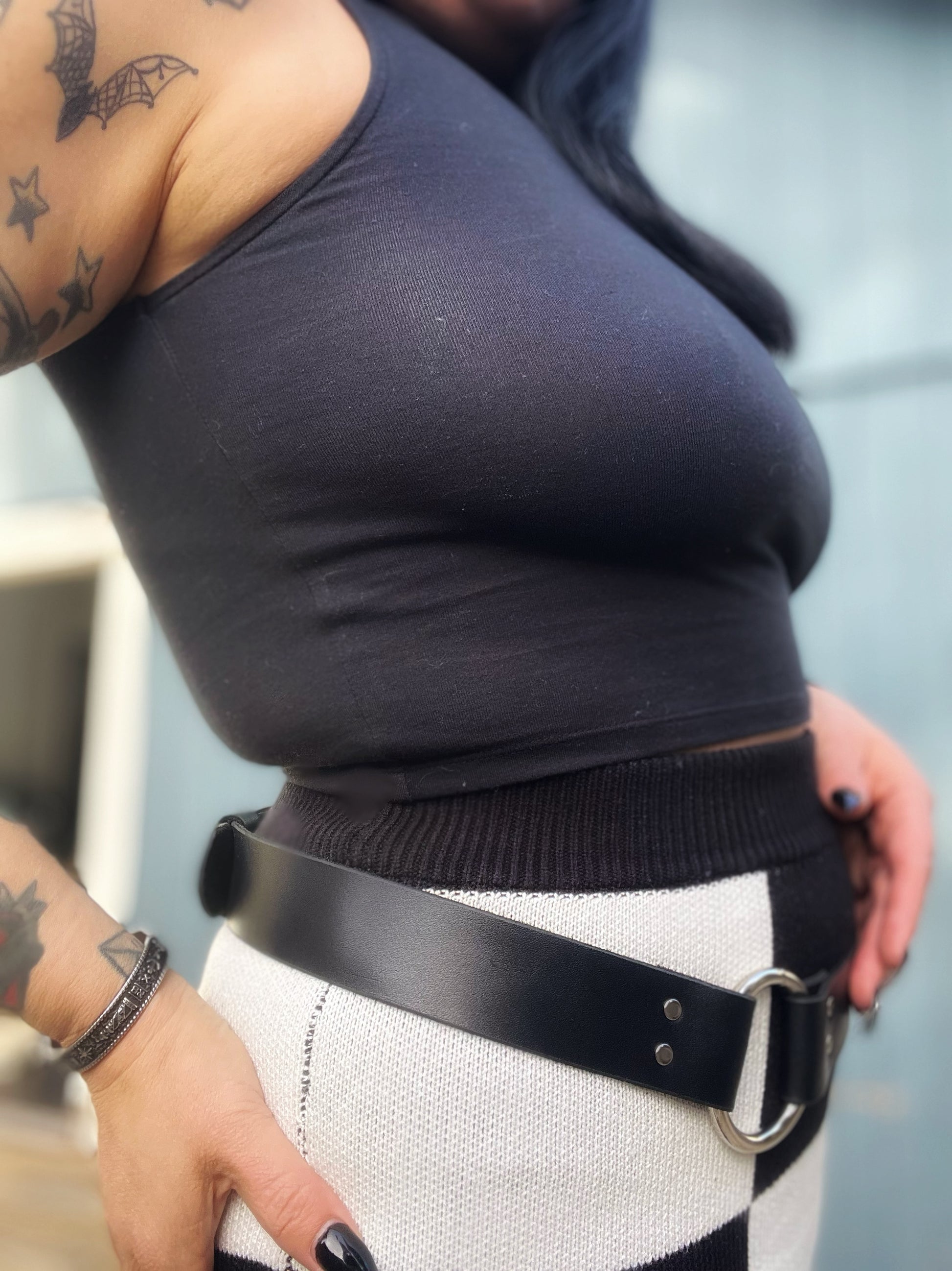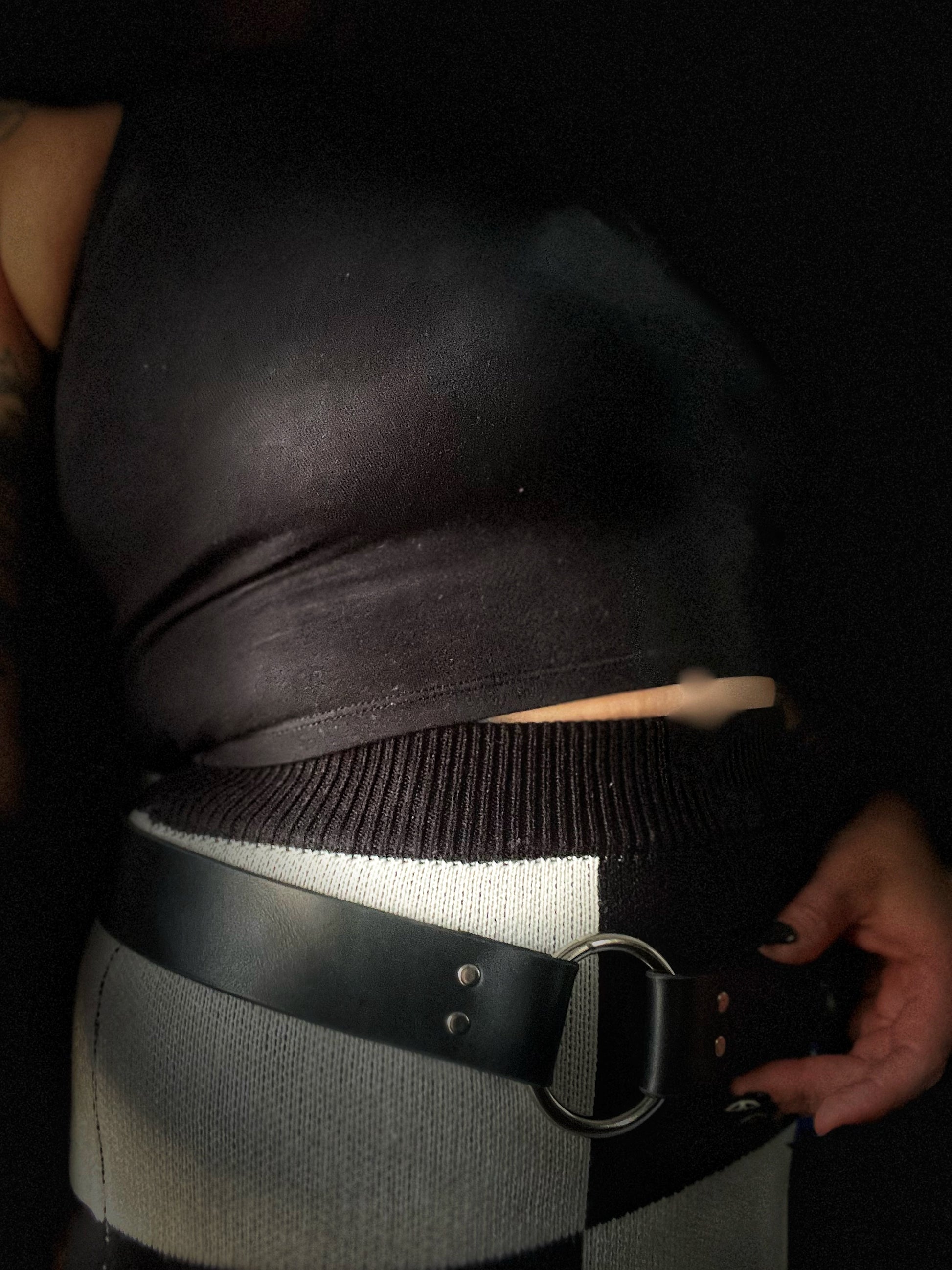 Feel strong and sexy while you drape this thick belt on your hips. And at night, bring it up to your chest and embrace your beauty with both rings encompassing your nipples with devilish delight.