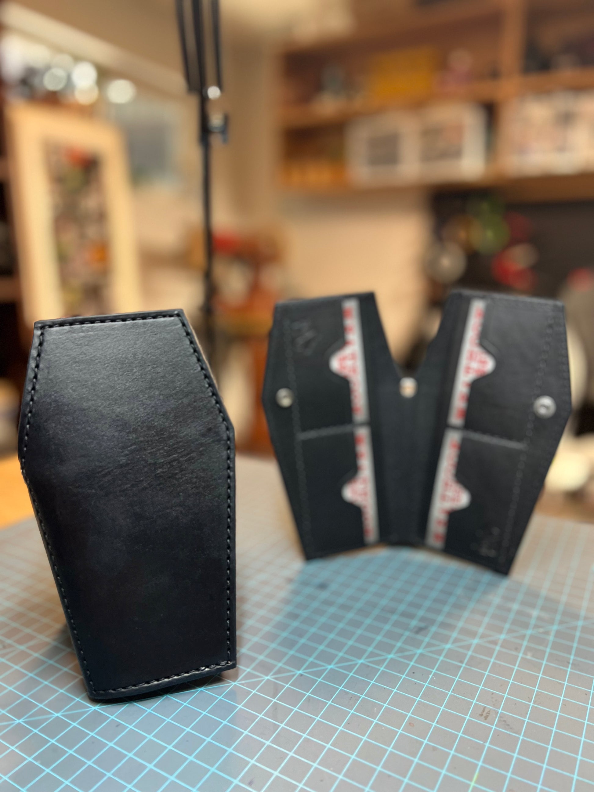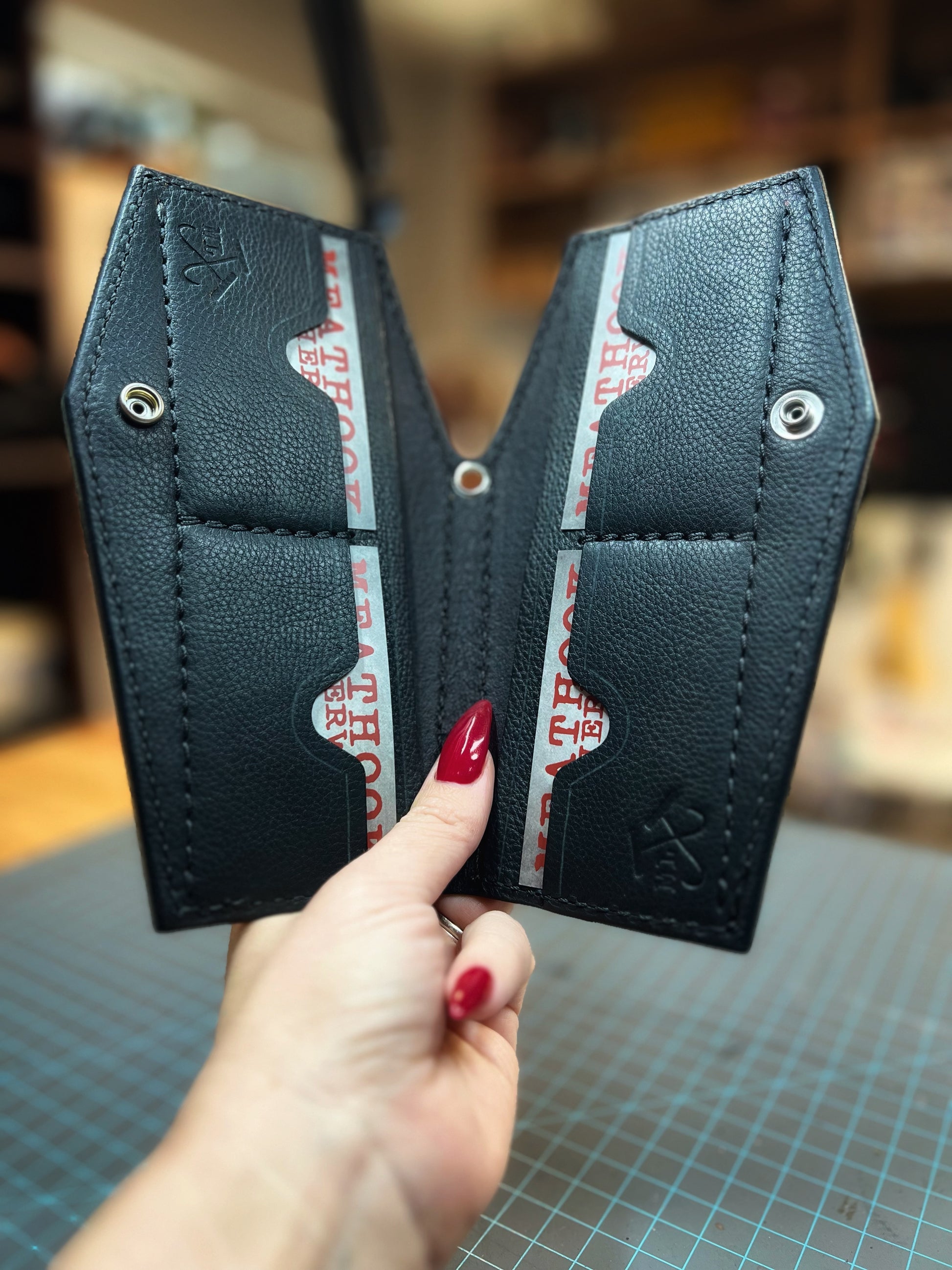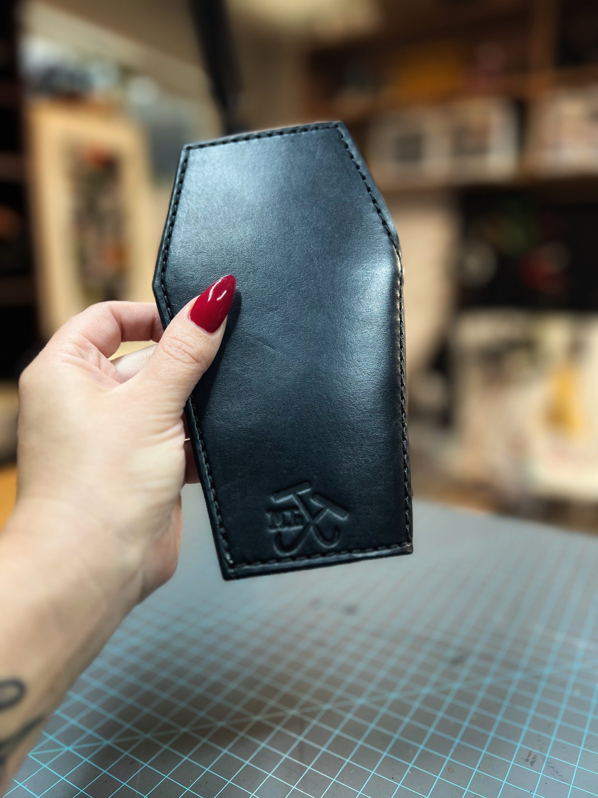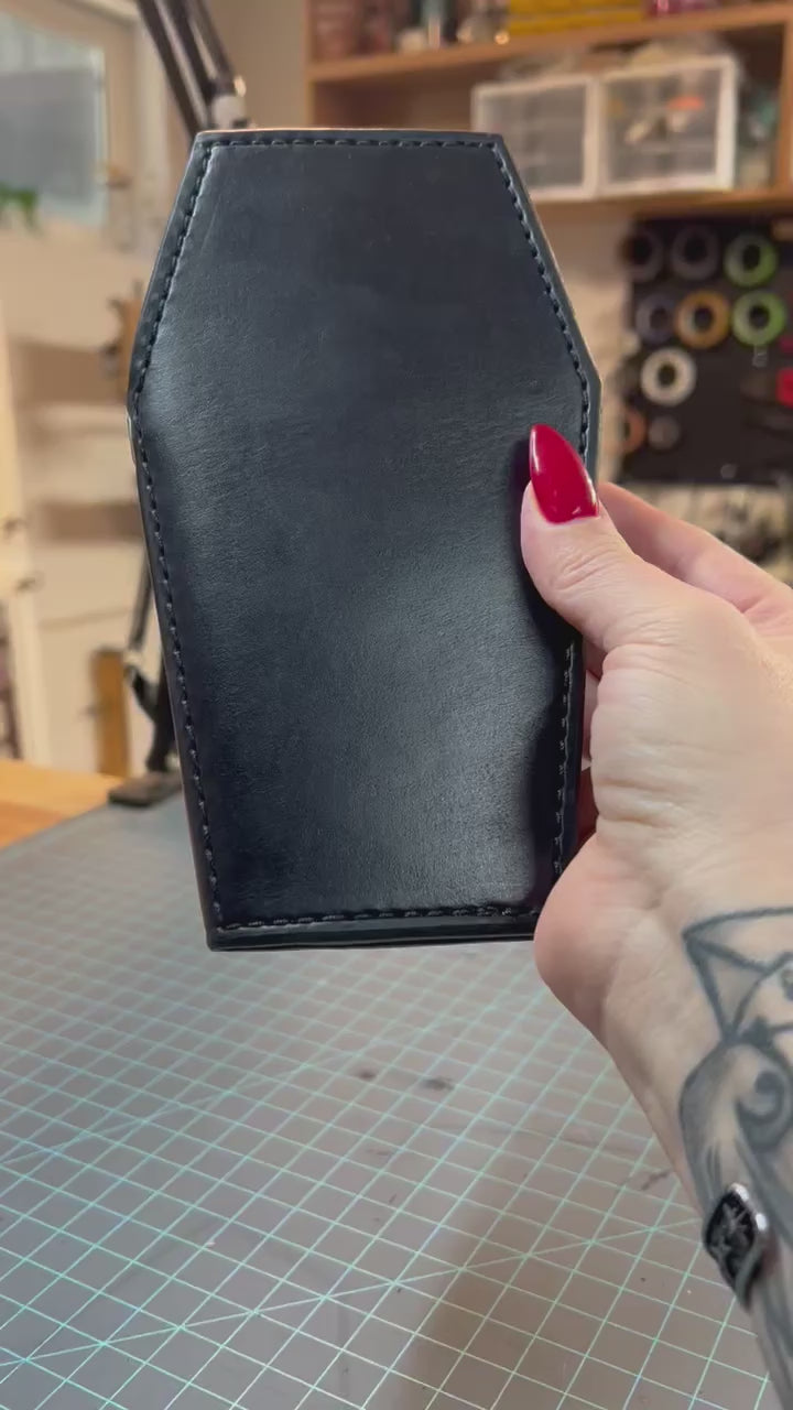 This full grain leather coffin wallet boasts a stylish yet functional design. At 7 3/4" tall, it sticks slightly out of most pant pockets for a subtle visual element. The wallet fits up to 12 cards (3 in each pocket), as well as full-length bills on either side, making sure you never go without your most essential forms of payment or identification.