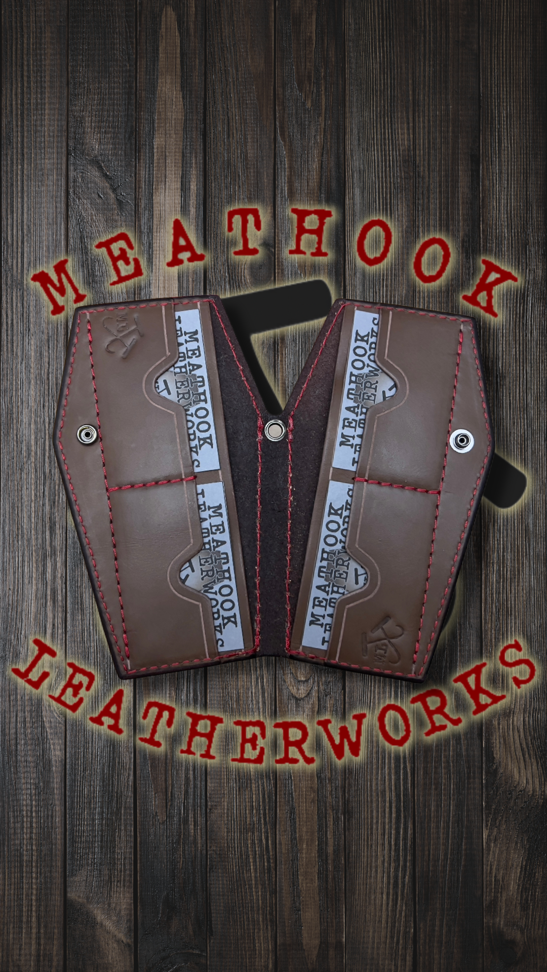 This full grain leather coffin wallet boasts a stylish yet functional design. At 7 3/4" tall, it sticks slightly out of most pant pockets for a subtle visual element. The wallet fits up to 12 cards (3 in each pocket), as well as full-length bills on either side, making sure you never go without your most essential forms of payment or identification.