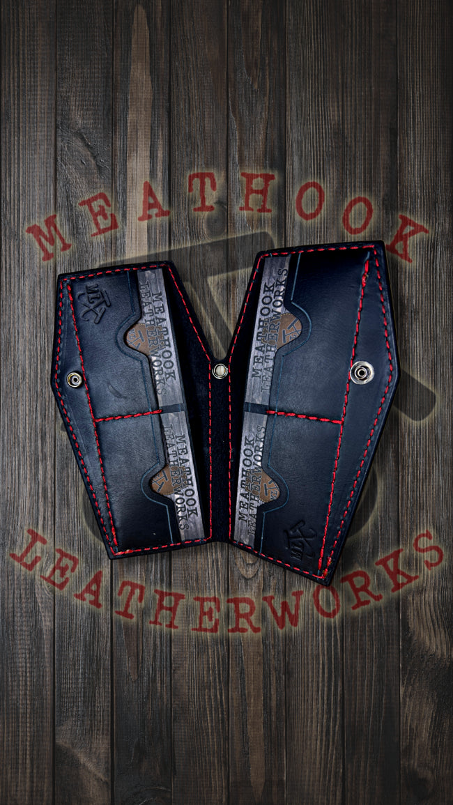 This full grain leather COFFIN WALLET has a one of a kind Gravel Stomp texture that makes it one-of-a-kind. It stands 7 3/4" tall, and is sure to start conversations by sticking out of most pant's back pockets. The inside can fit up to 12 cards (3 in each pocket), as well as full length bills on either side, meeting the needs of individuals looking for a functional conversation piece.