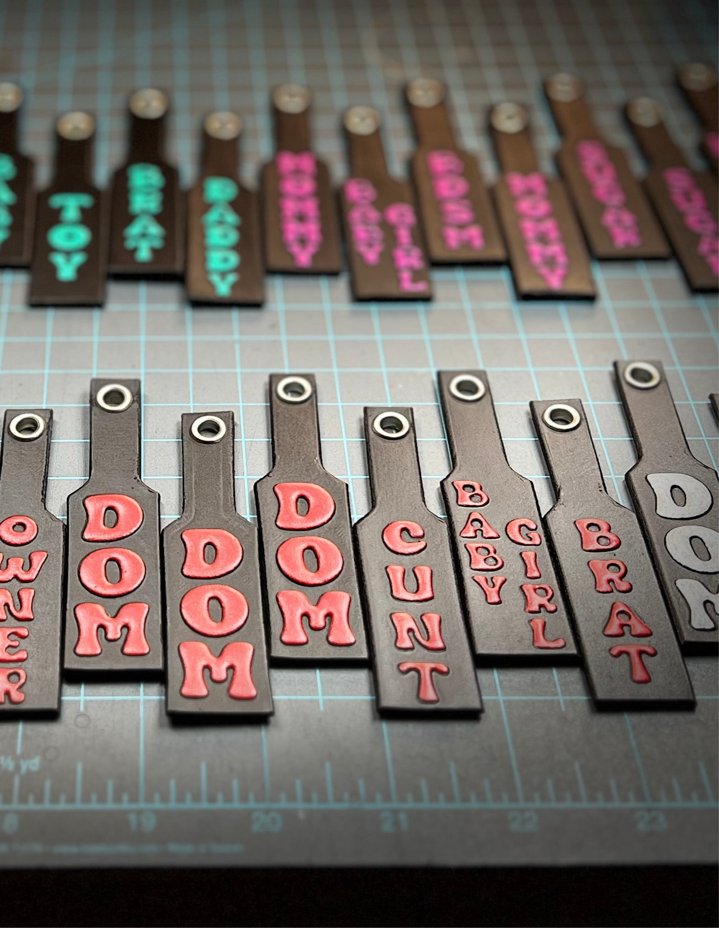 Let your freak flag fly, subtly though. These are made from premium leather and oh so perfect. They're small, they're leather, they go on your keys, they're kinky - I mean, what else could you ask for? I will be adding new photos and phrases often. Keep your eyes peeled.