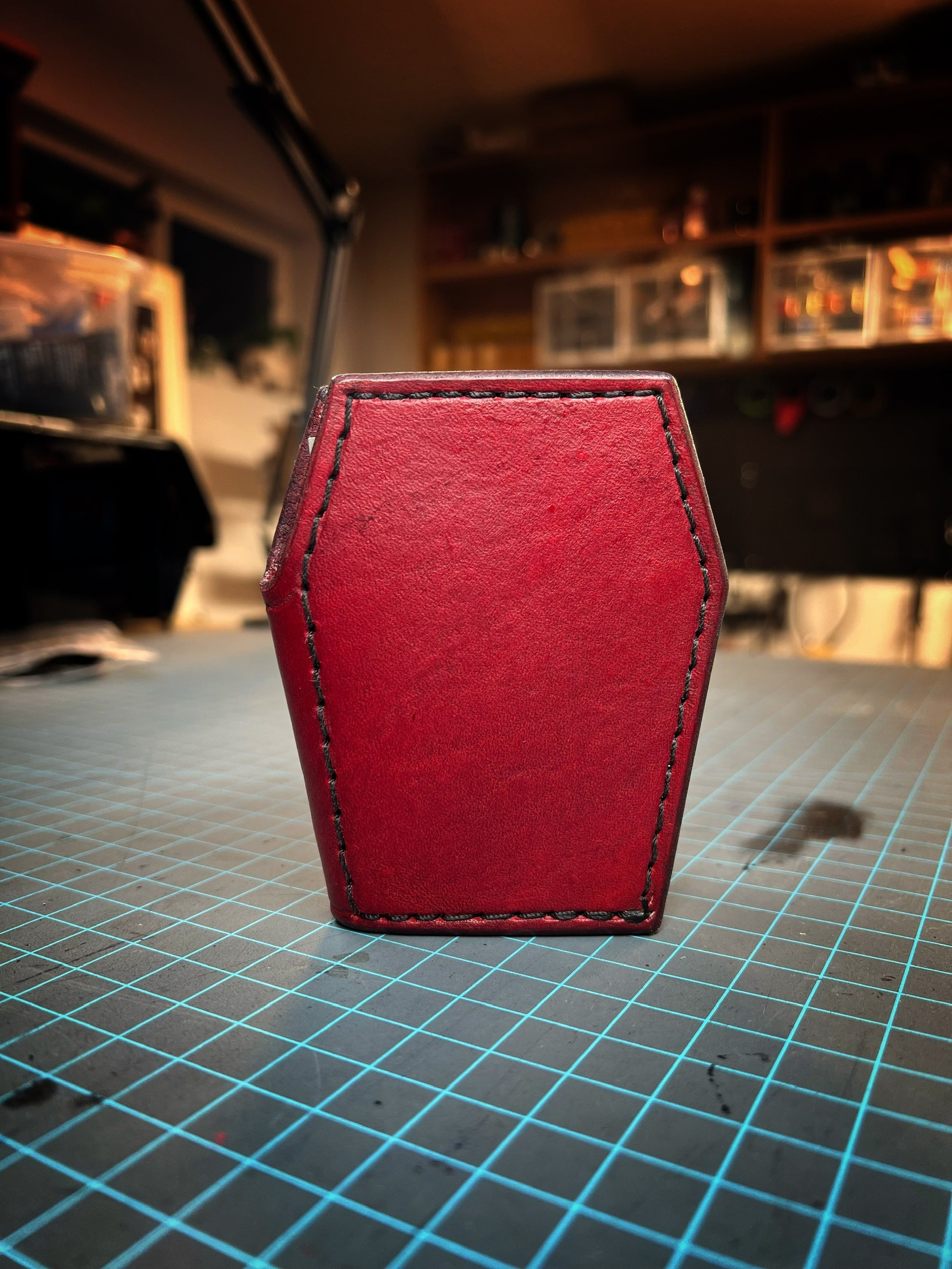 Feel the power of this MICRO yet MIGHTY creation, featuring the iconic coffin shape of Meathook Leatherworks. With the ability to hold 4-8 cards and folded cash, this wallet keeps your essentials secure with a sturdy metal snap. Don’t sleep on this bold piece of functional art!