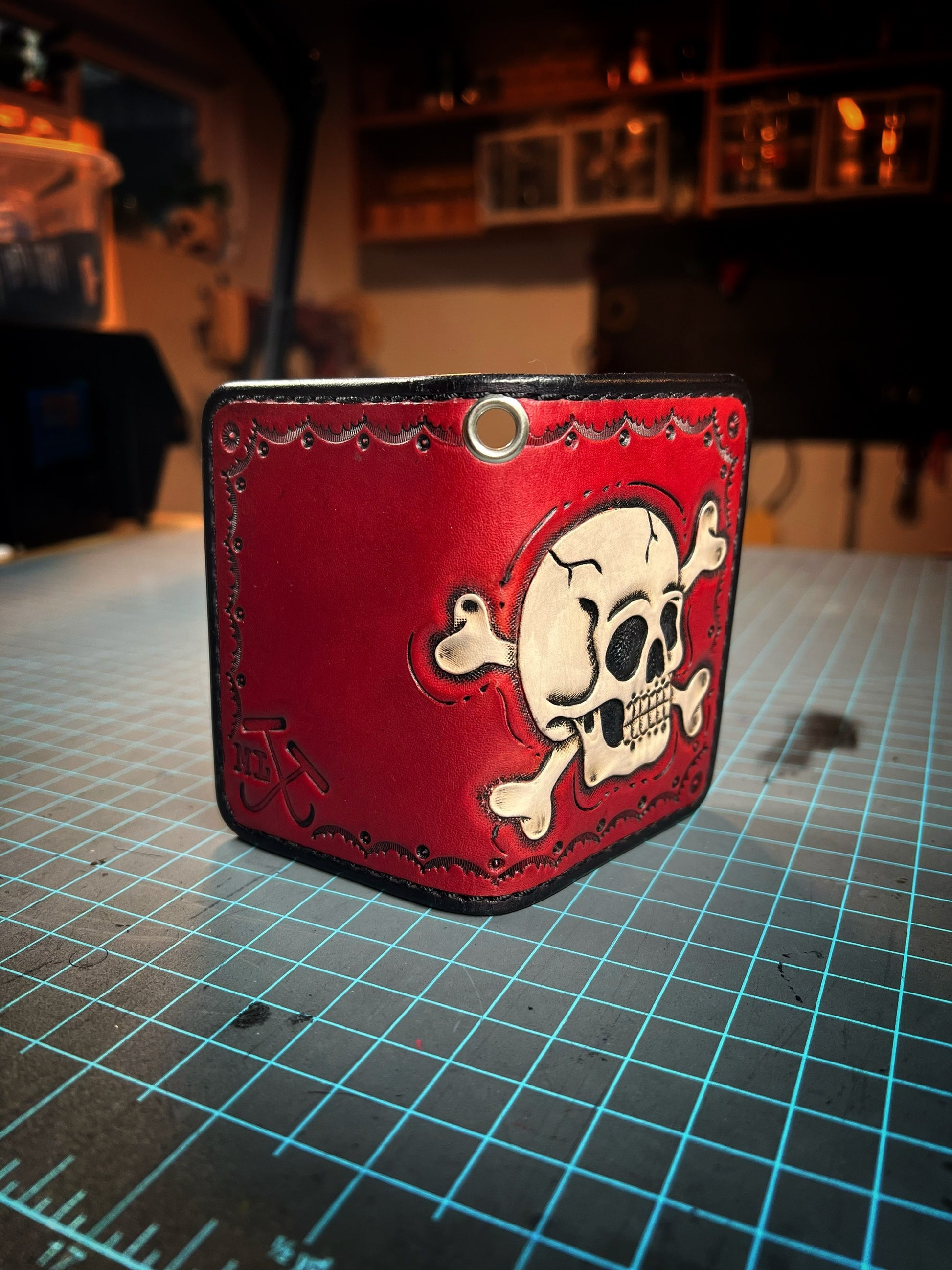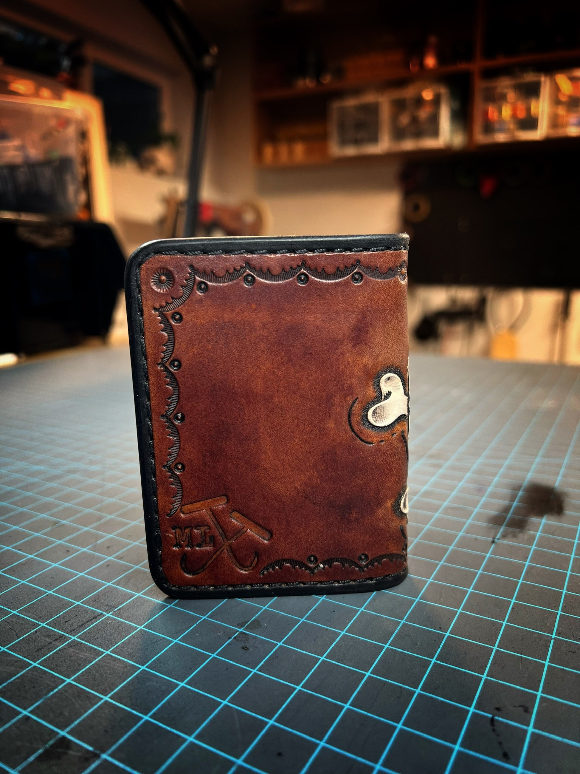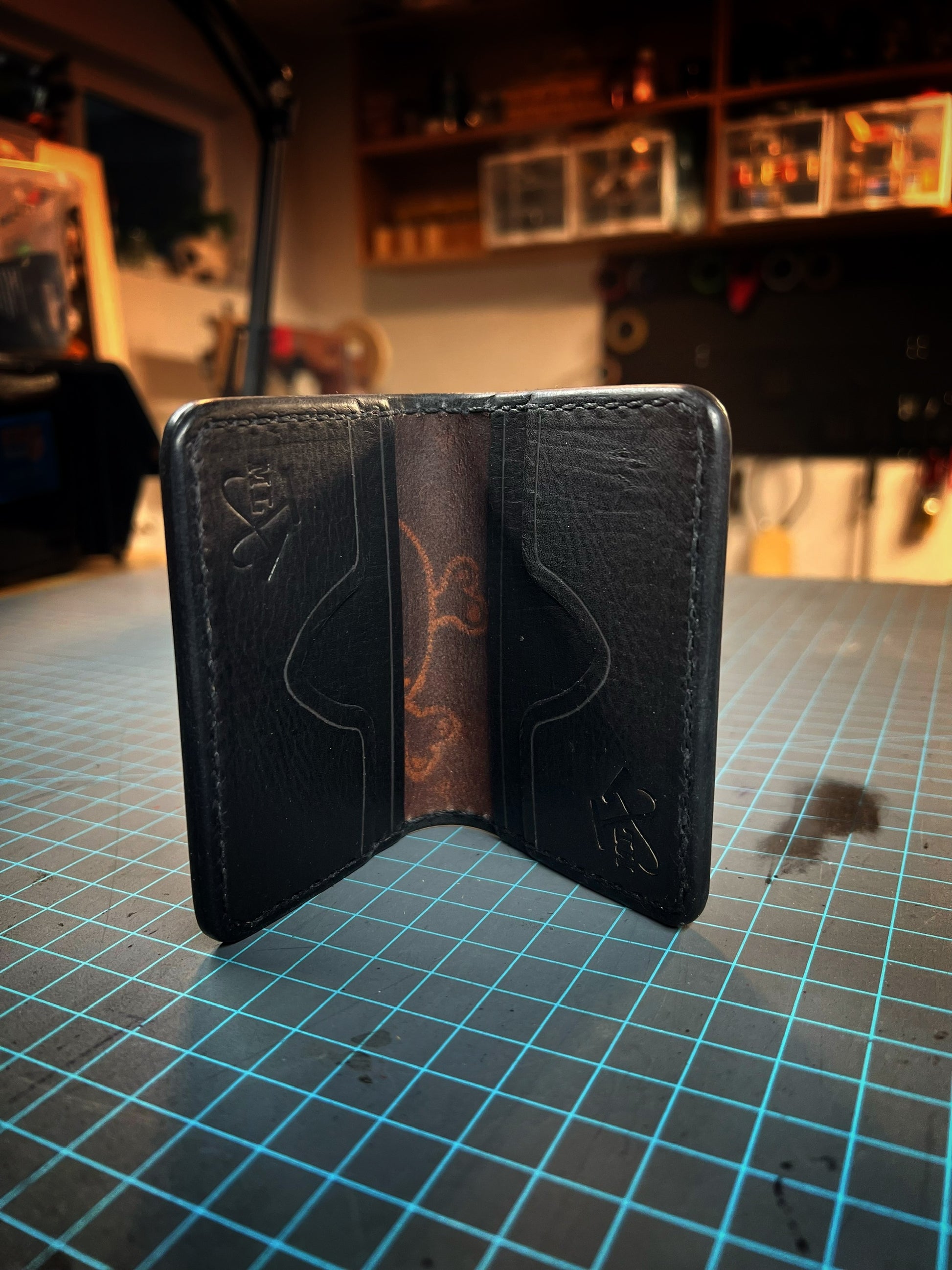 this hand carved card wallet is built from premium full grain leather. You can stash up to six cards and folded cash if you need to. This minimalist carry can even fit comfortably in your front pocket.