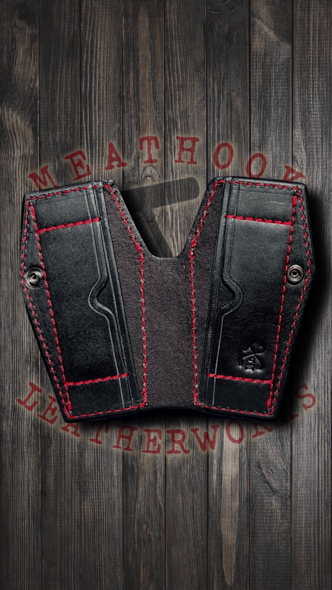 Rocking front to back hand tooled spiderwebs, This minimalistic Shorty coffin wallet is perfect for those who are looking for a smaller carrying solution. It can comfortably carry up to 4 cards, 2 per slot, and a few folded bills. It also includes a metal grommet-reinforced hole which is compatible with a braided leather wallet leash or a chain of your choice. At 5 3/4 inches tall, it is small enough to fit in your front pocket, inside vest pocket, or jacket pocket with ease.