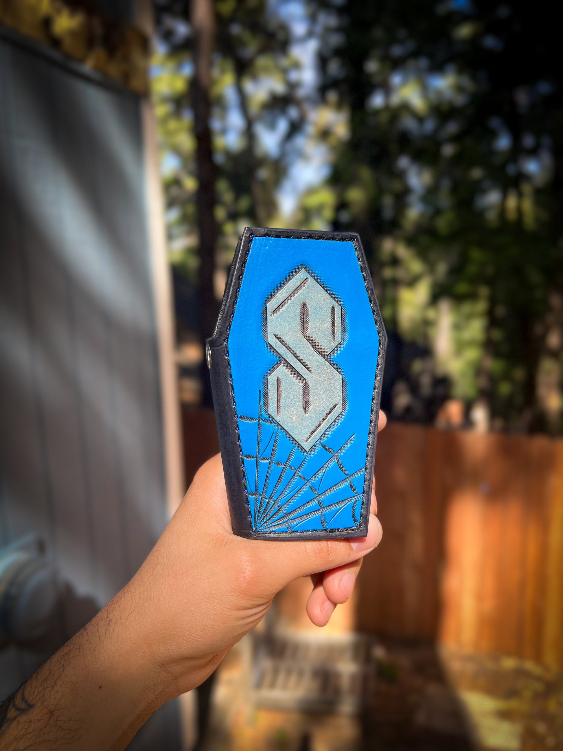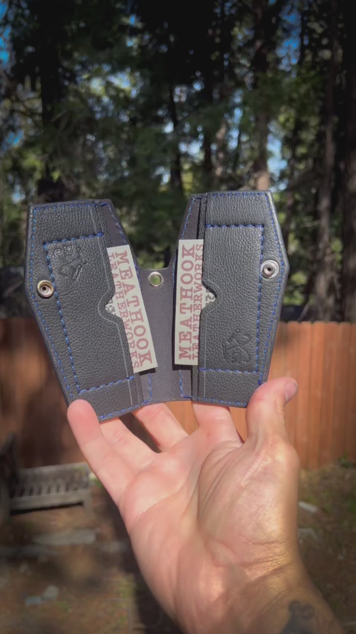 Thee “S” - now available in wallet form. Mini Coffin wallet can hold up to 12 cards and folded cash if needed. Sporting a metal reinforced hole for your wallet leash and a snap closure to keep your stash secure.
